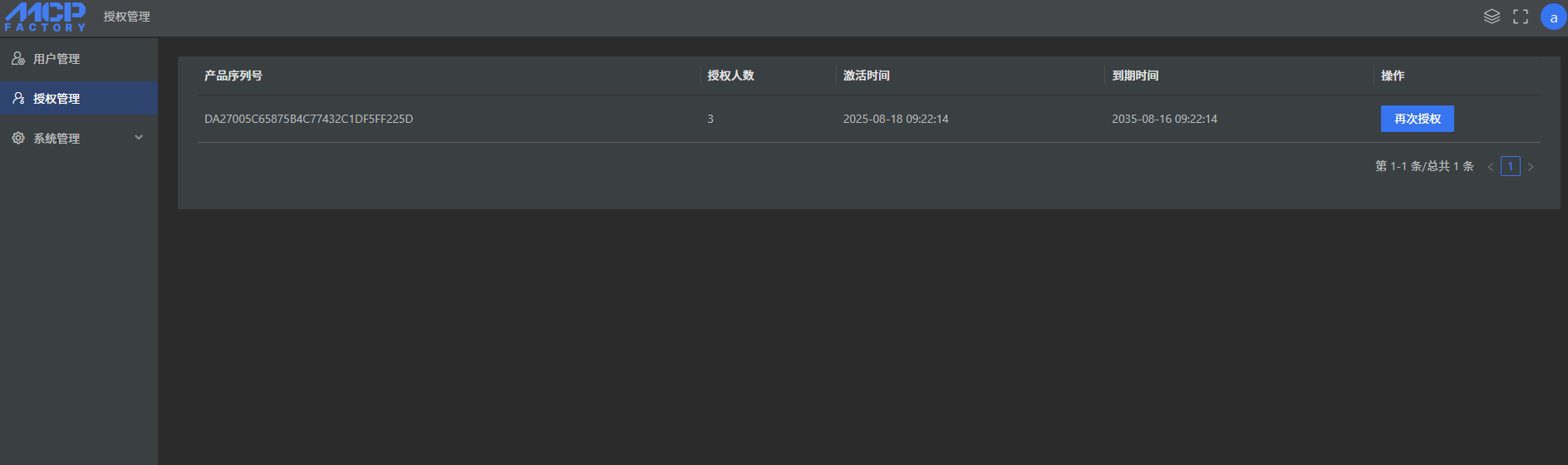 管理员登录 MCP Factory 后,进入后台管理,选择“授权管理”,可以查看产品序列号、授权人数、激活时间、到期时间。