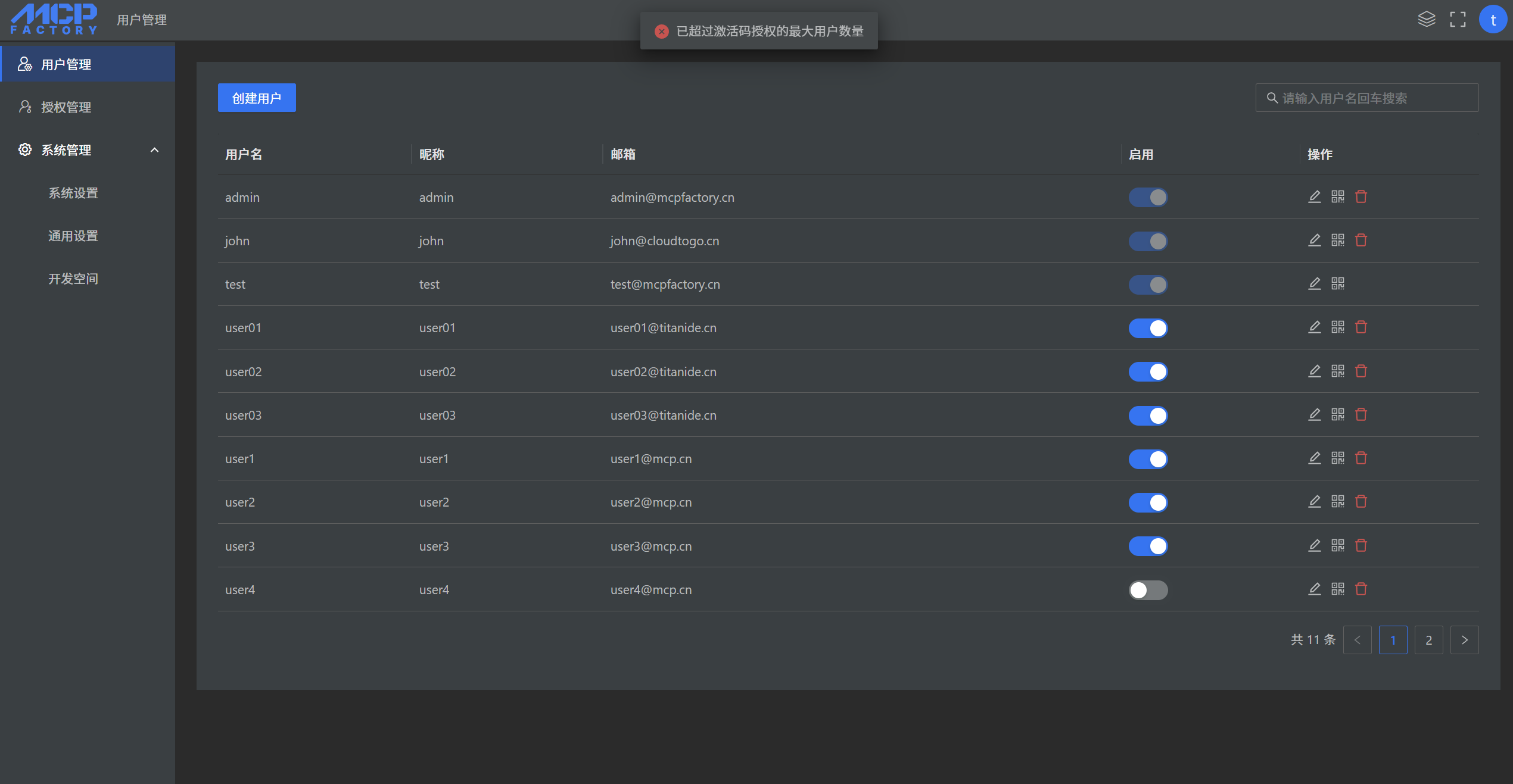 管理员登录MCP Factory后,进入后台管理,点击用户管理,激活用户,当激活用户的数量超过激活码的用户数量,激活用户失败,并提示“已超过激活码授权的最大用户数量”。