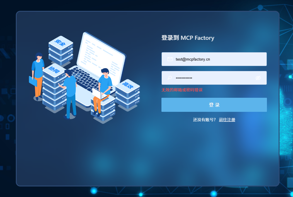 目标用户使用原来的密码登录MCP Factory,登录失败,提示邮箱或者密码出错