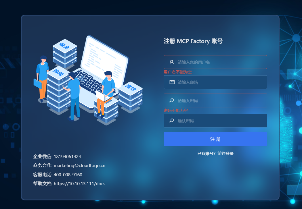 首先打开MCP Factory的网址,例如"https://start.titanide.cn/",点击“前往注册”。