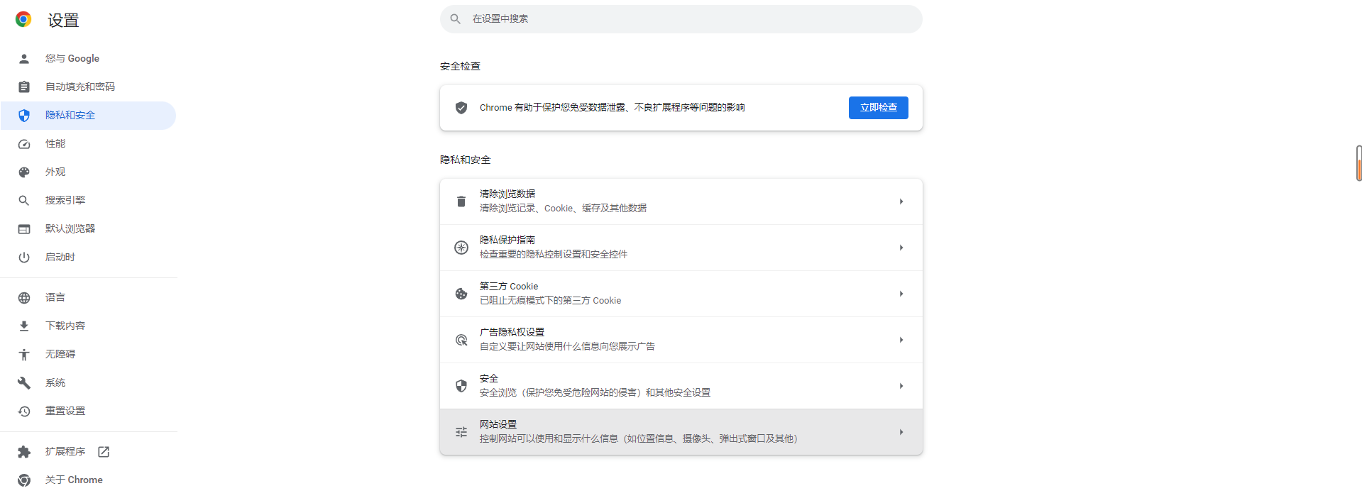 在左侧栏找到隐私和安全 > 网站设置