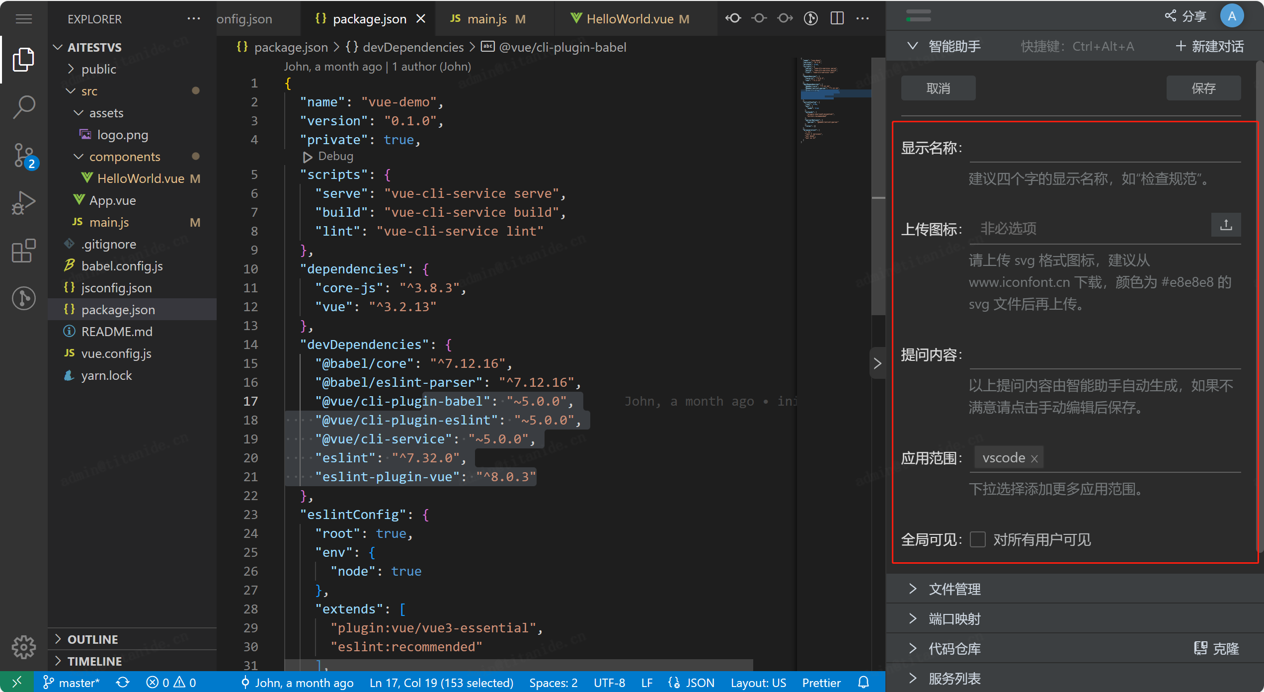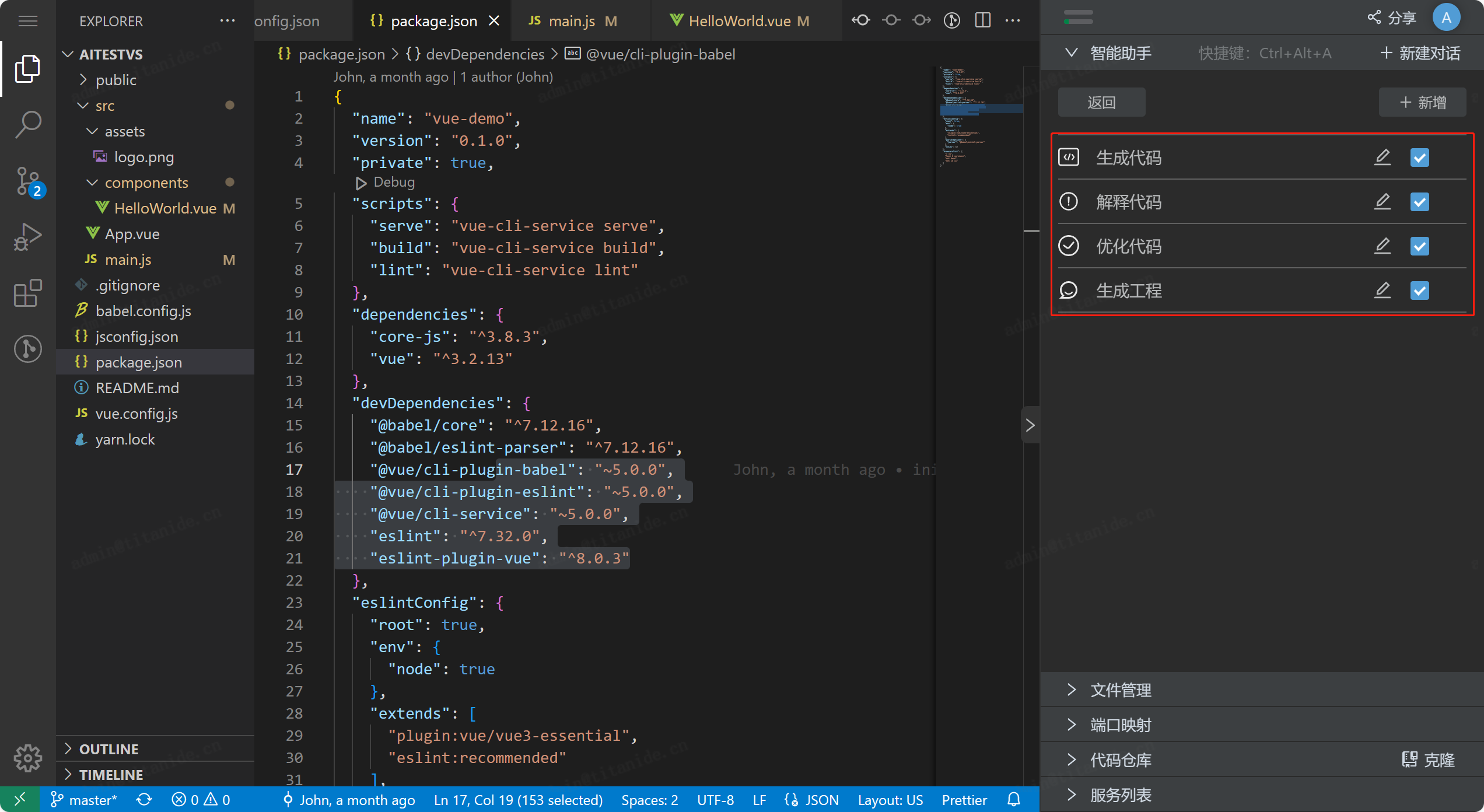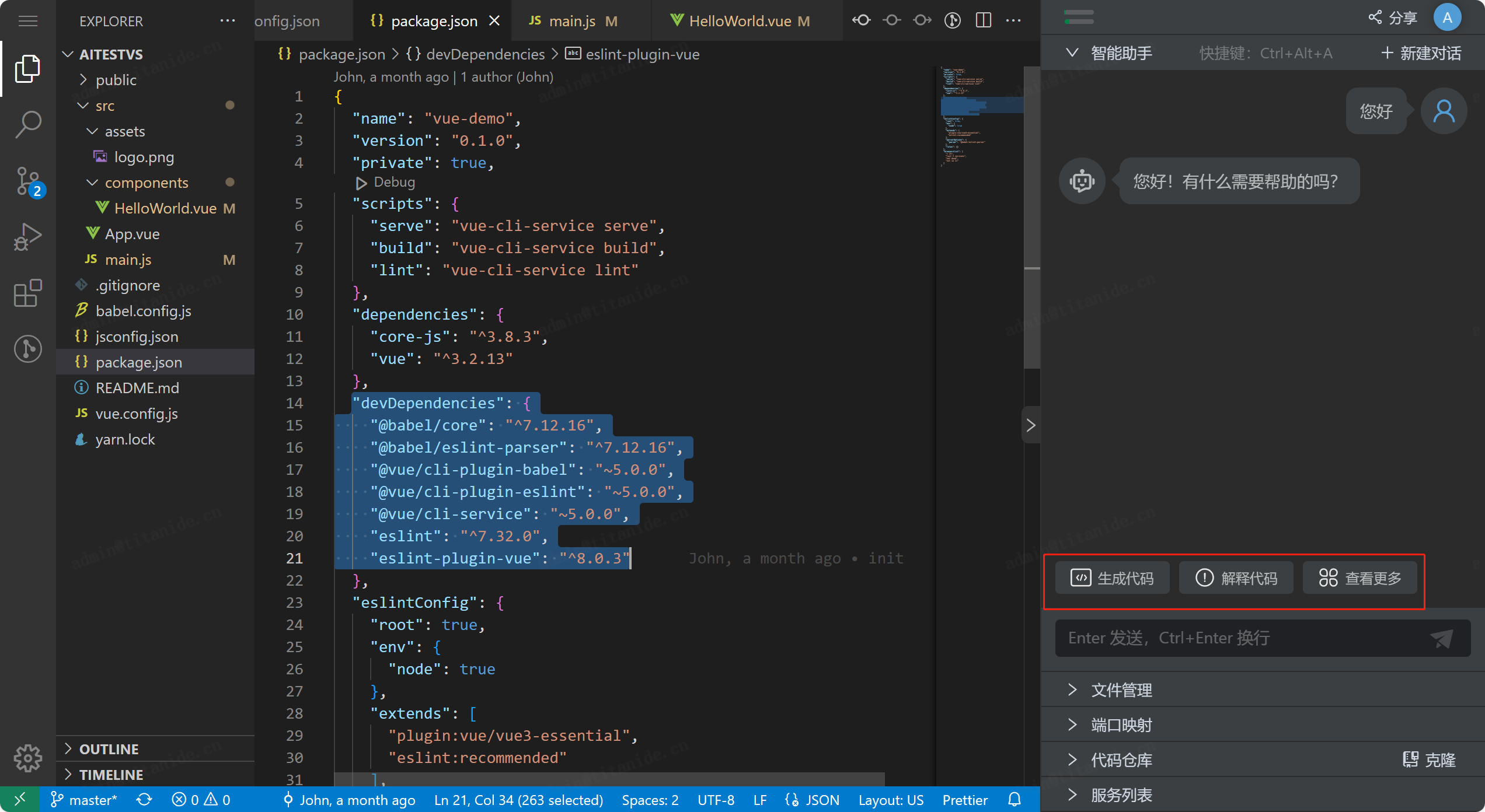 智能助手在产品的侧边栏进行展示,主界面以问答形式提供AI功能。当我们选中内容后,会提供解释代码,生成代码的子功能按钮,用户还可以根据个人设置在“查看更多”中进行个性化配置。