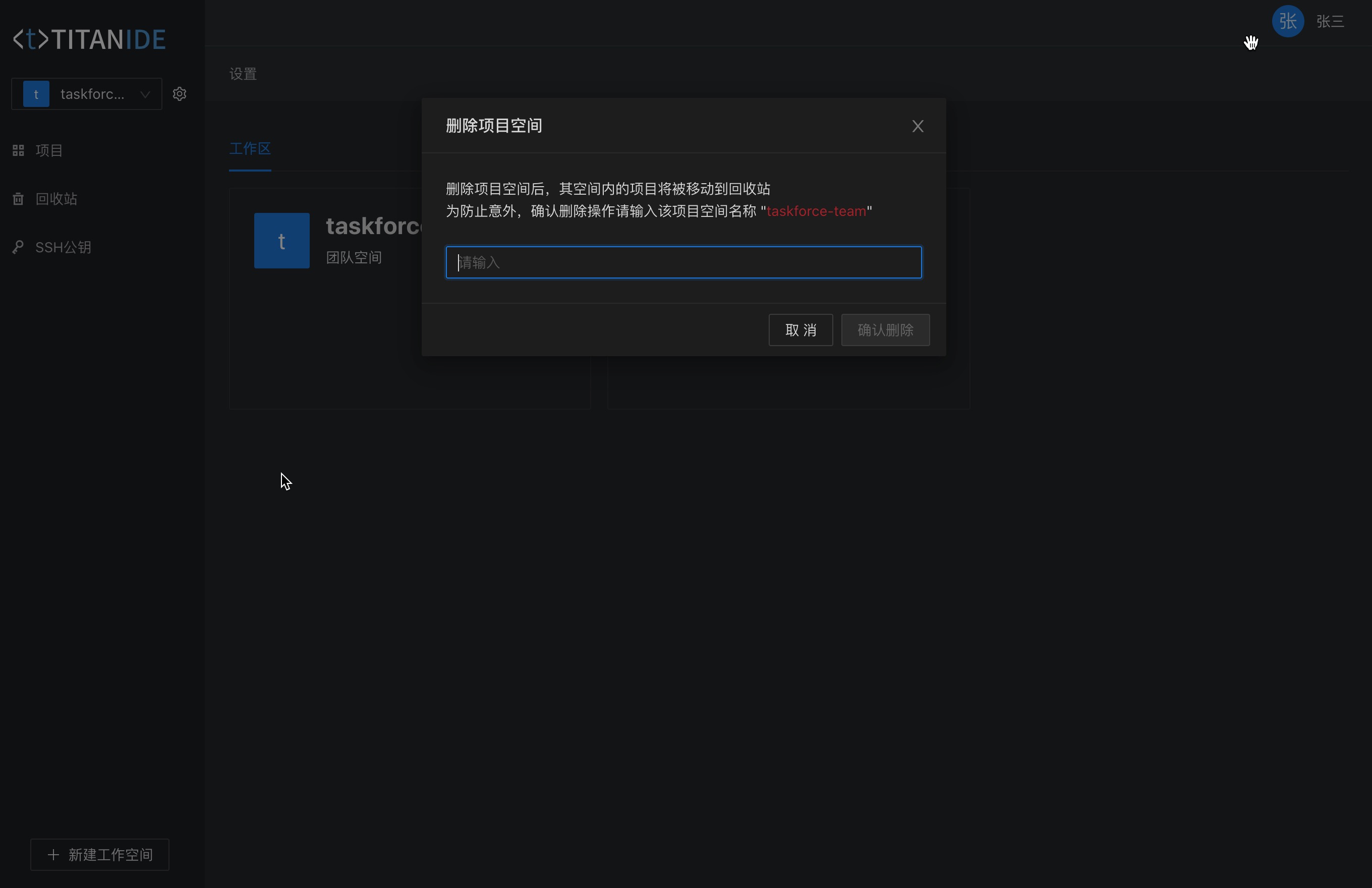 由于删除之后,开发空间将不可恢复,因此需要操作人员二次确认后方能被删除。