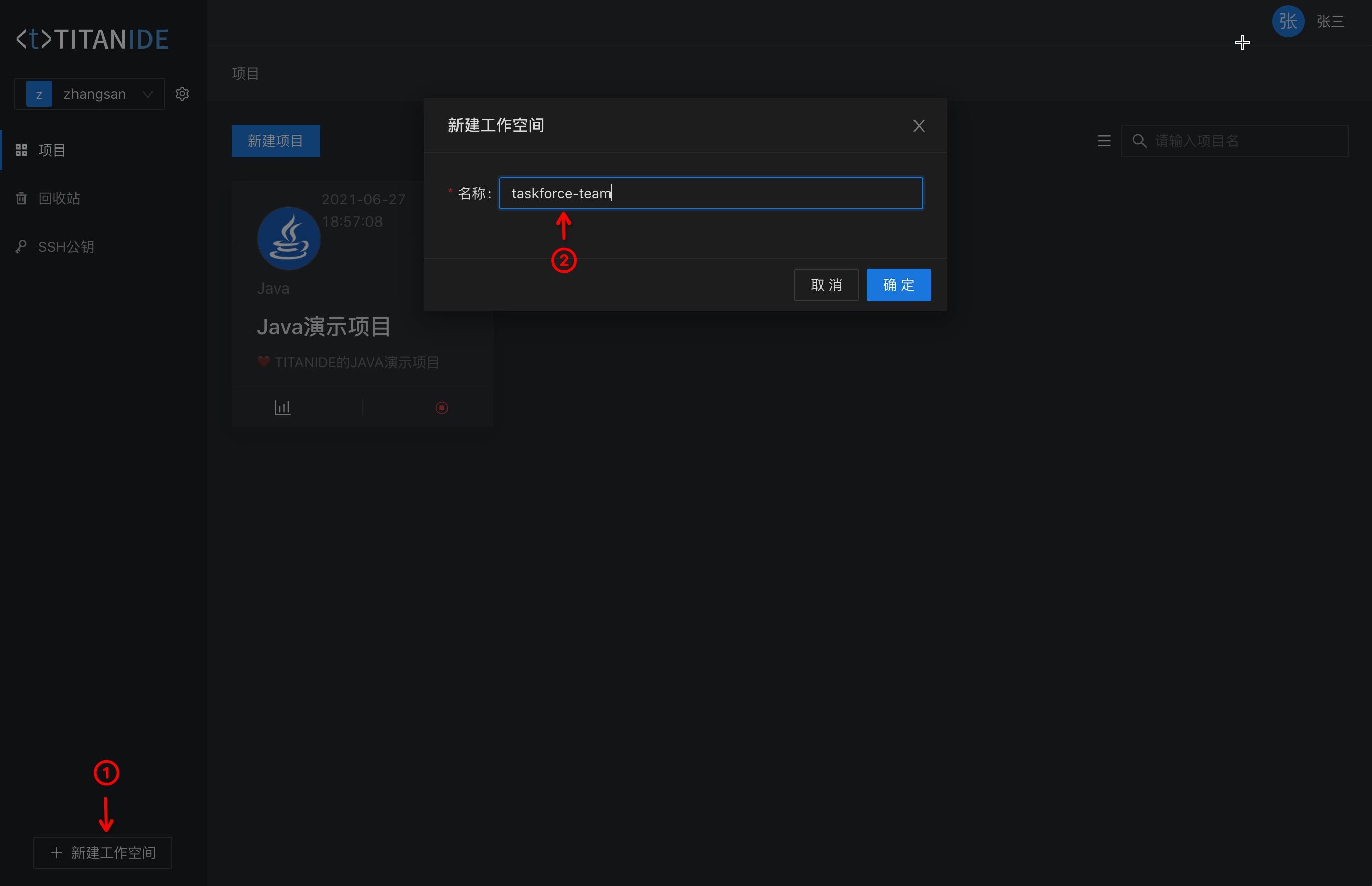 MCP Factory默认会为您创建一个与您的用户名同名的开发空间,您可以在这个开发空间下管理您的 项目。如果您需要创建更多的开发空间,你们您只需要简单的两步即可完成。